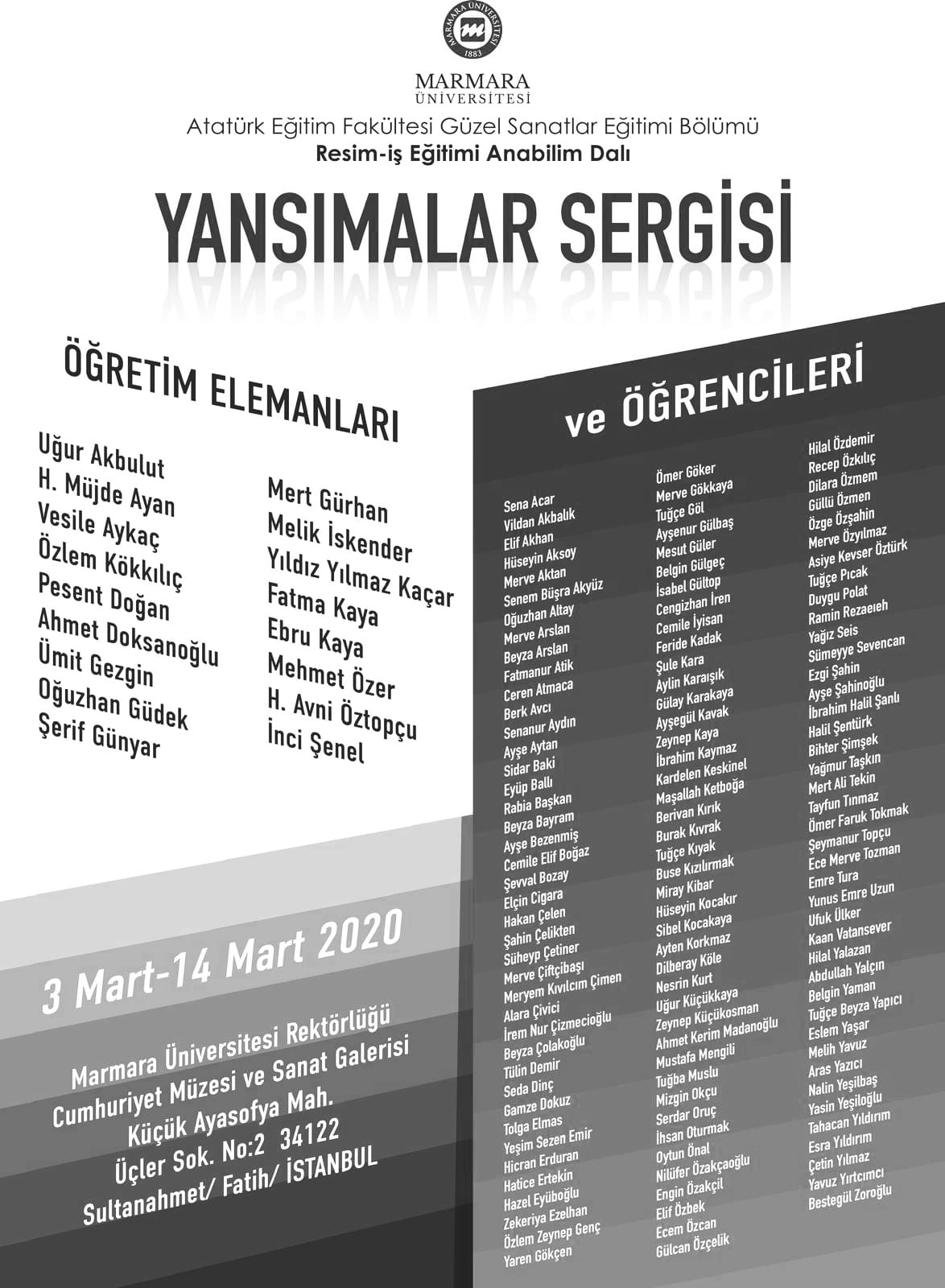 Atatürk Eğitim Fakültesi Güzel Sanatlar Eğitimi Bölümü Resim-İş Eğitimi Anabilim Dalı Sanat Egitimcileri ve öğrencilerinin çalışmalarının yer aldığı “Yansımalar” sergisi, 3 Mart 2020 saat 15.30 da, Marmara Üniversitesi Rektörlüğü Cumhuriyet Müzesi ve Sanat Galerisi’nde izleyici ile buluşacak.